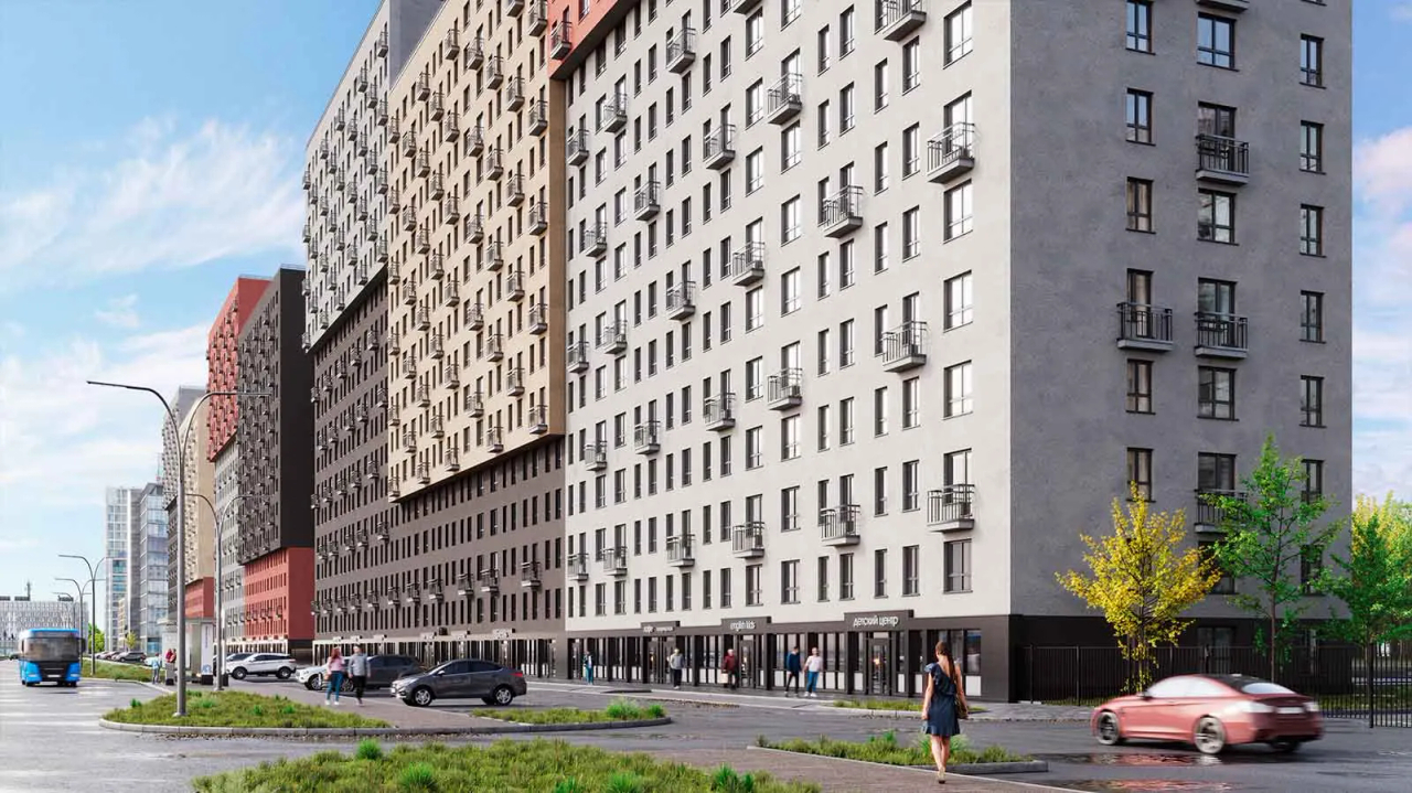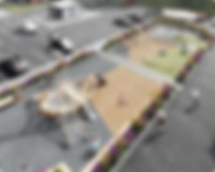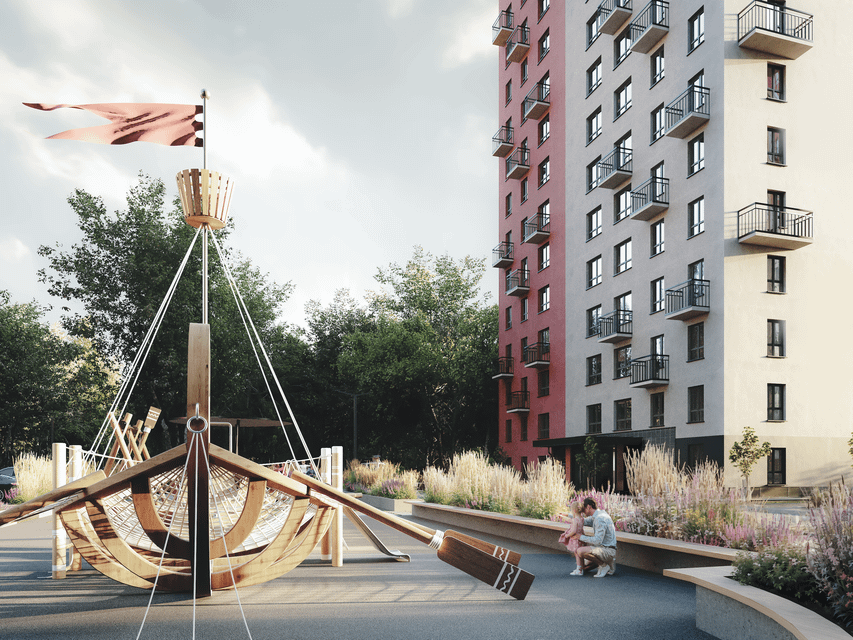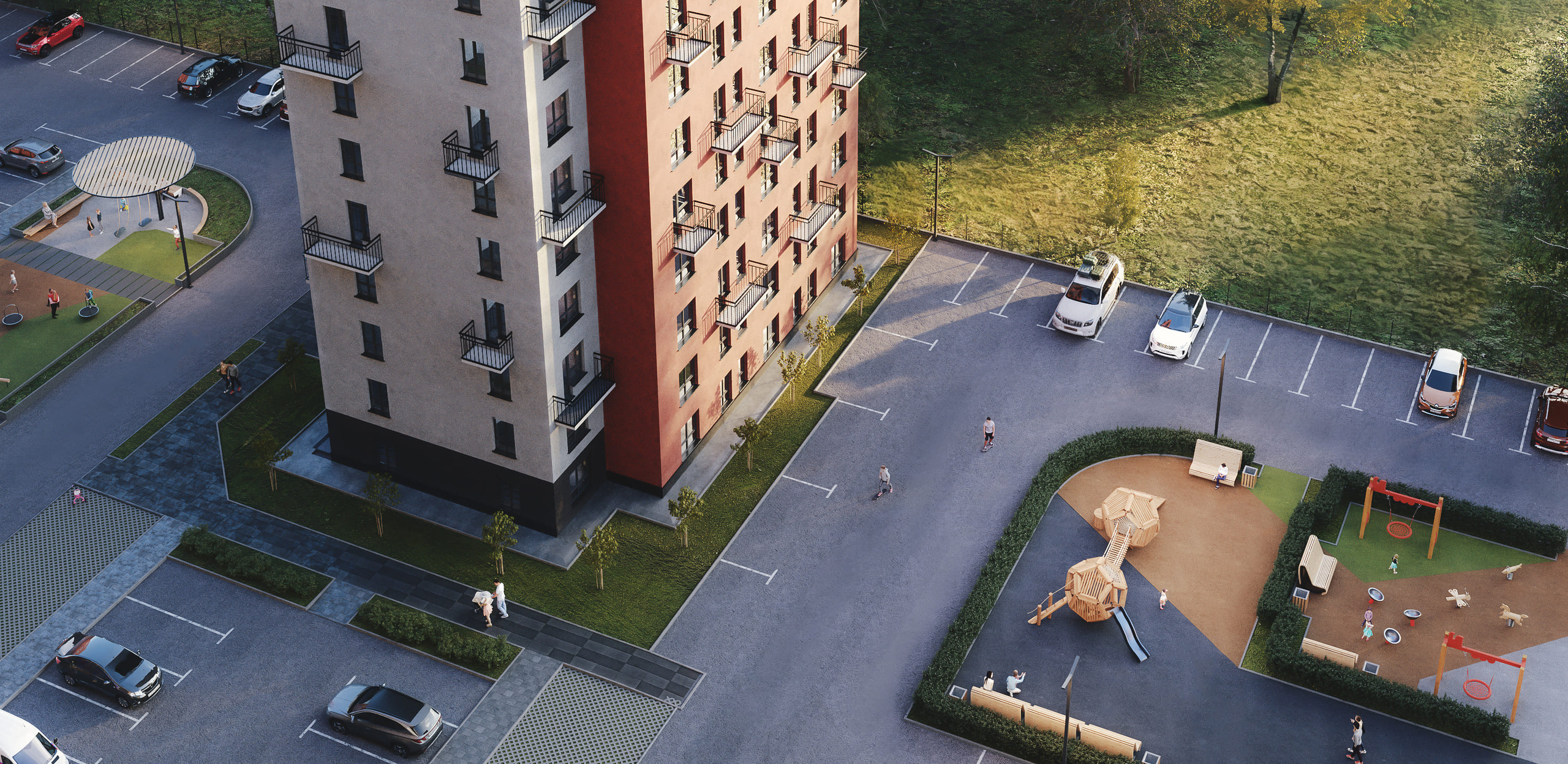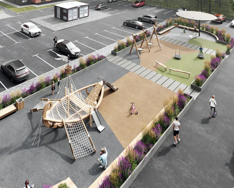 Созданная по принципу двор-парка с качелями, беседками, песочницей и большой елкой во дворе. По периметру зоны притяжения предусмотрена дорожка для самокатов и велосипедов.