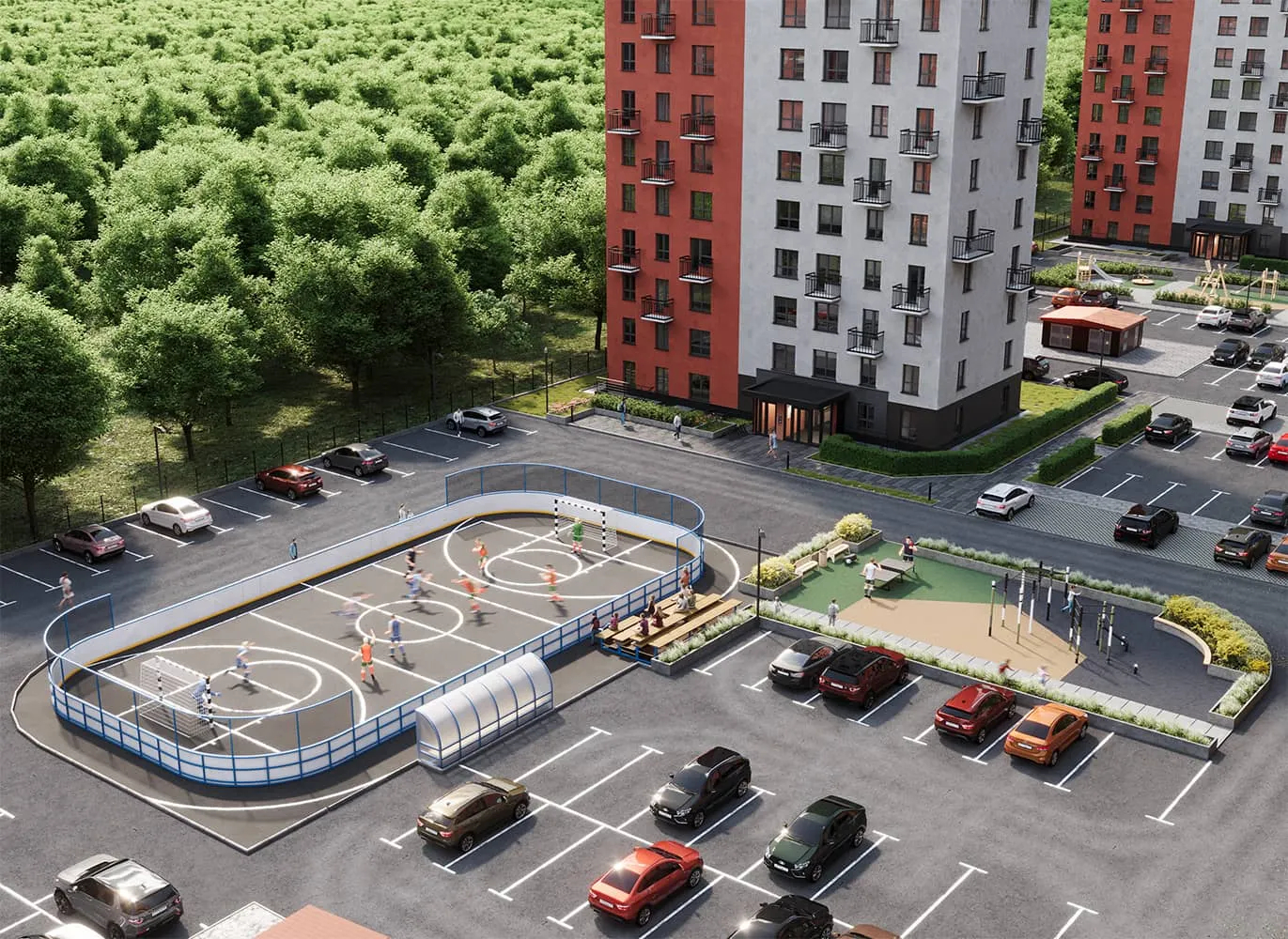 Зона с уличными тренажерами и хоккейная коробка с трибунами. Прямо в жилом комплексе в зимний период, как дети, так и взрослые смогут поиграть в хоккей и покататься на коньках. А летом там можно играть в футбол, волейбол, большой теннис и другие виды спорта.